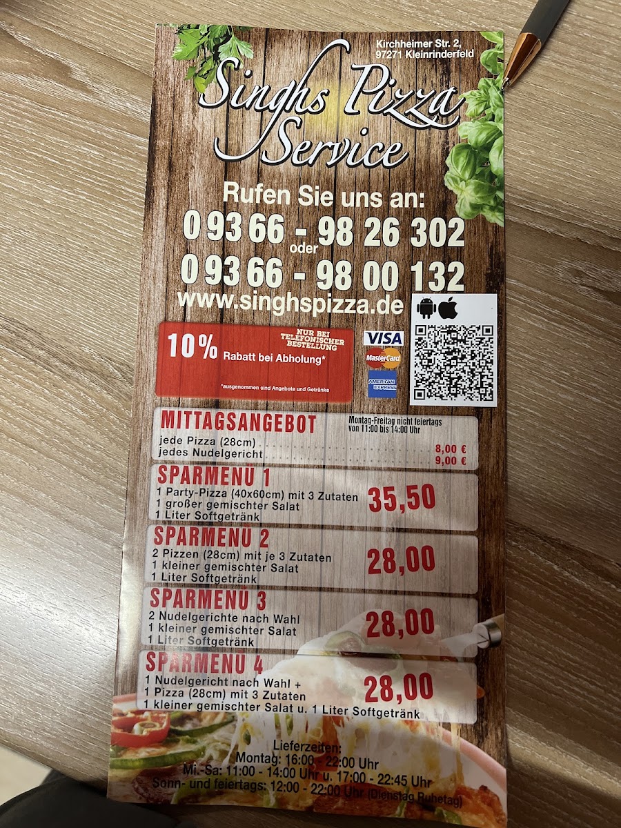 Welcome to Singhs Pizza Service Kleinrinderfeld, a culinary gem located at Kirchheimer Str. 2 in Kleinrinderfeld, Germany. Known for its mouthwatering pizzas, this establishment has garnered rave reviews from local enthusiasts. Diners consistently praise the quick service, with meals arriving hot and fresh, typically within a mere 45 minutes.